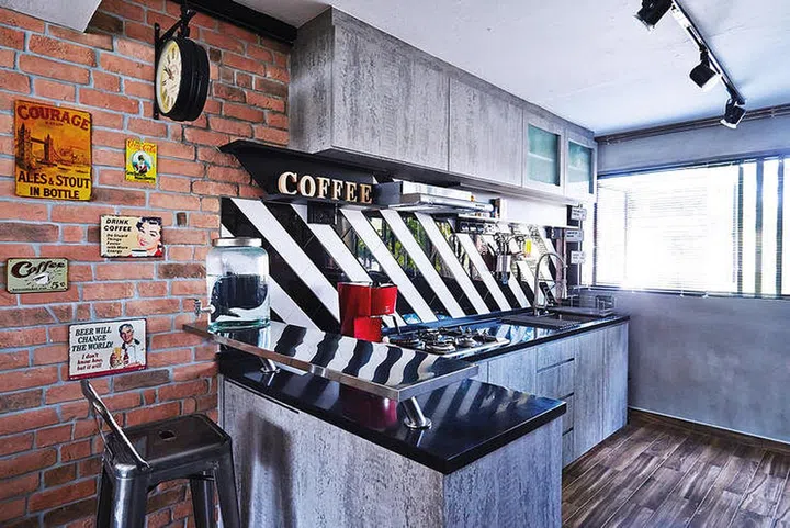 The black-and-white backsplash is an eye-catching element in this industrial-style kitchen.