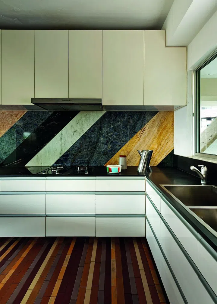 Advised by the feng shui master to inject shades of pink and red in the kitchen, the homeowner decided to go all-out with a bold, colour block concept.