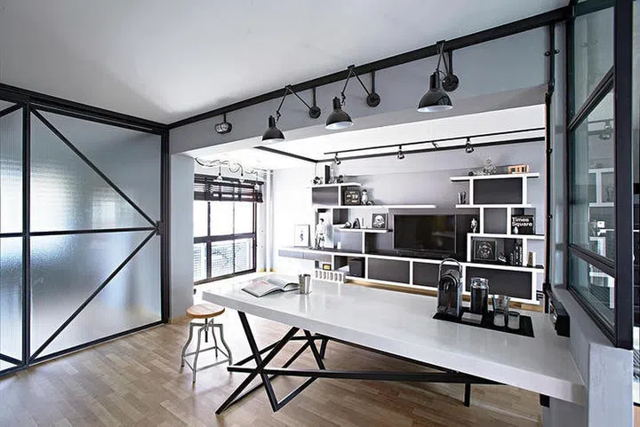 Black-framed glass-panel partitions are getting more popular with homeowners. Some like it as it opens up the space, while others like that the look goes well with the interior style at home, especially the industrial look.