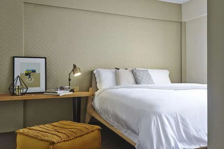 The master bedroom of this four-room HDB unit, which features a walk-in wardrobe and study nook, is inspired by the design of hotel rooms. A textured, champagne-hued wallpaper on the wall behind the bed adds a luxurious feel.