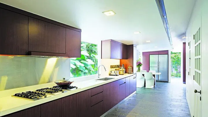 Designed by designer Aamer Taher, this two-storey, L-shaped house off Holland Road is done in a contemporary, black and white style. One wing is where the foyer and homeowner David Liao's bedroom is, while the other wing houses the living and dining areas, and four bedrooms.