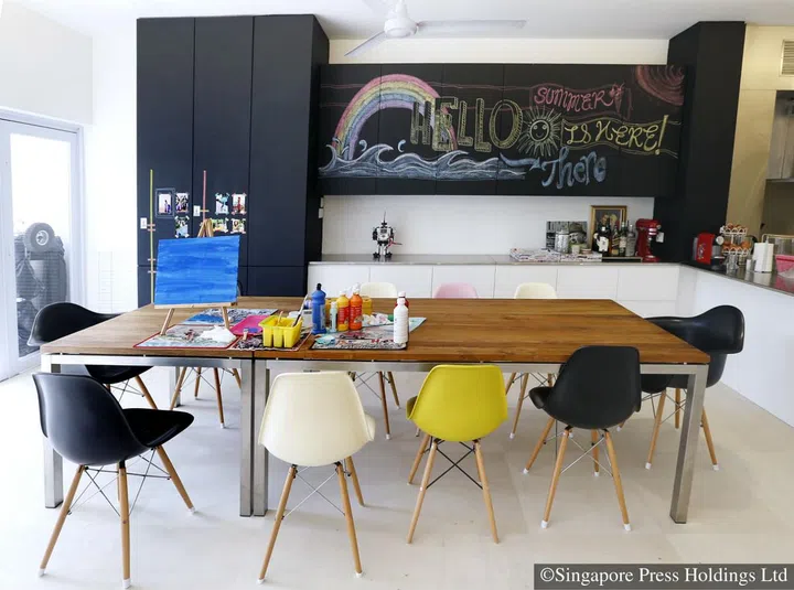 “In my mind, I wanted a home for the kids to interact,” Ms Shi says. To do this, she made play an essential part of her decorating scheme. This includes the huge 10-seater dining table that doubles as a play table for the children’s many hobbies such as painting, board games and various handicrafts. The dining table is specially treated for outdoor use and to withstand the rigours of play. “It’s my favourite piece of furniture,” she adds.