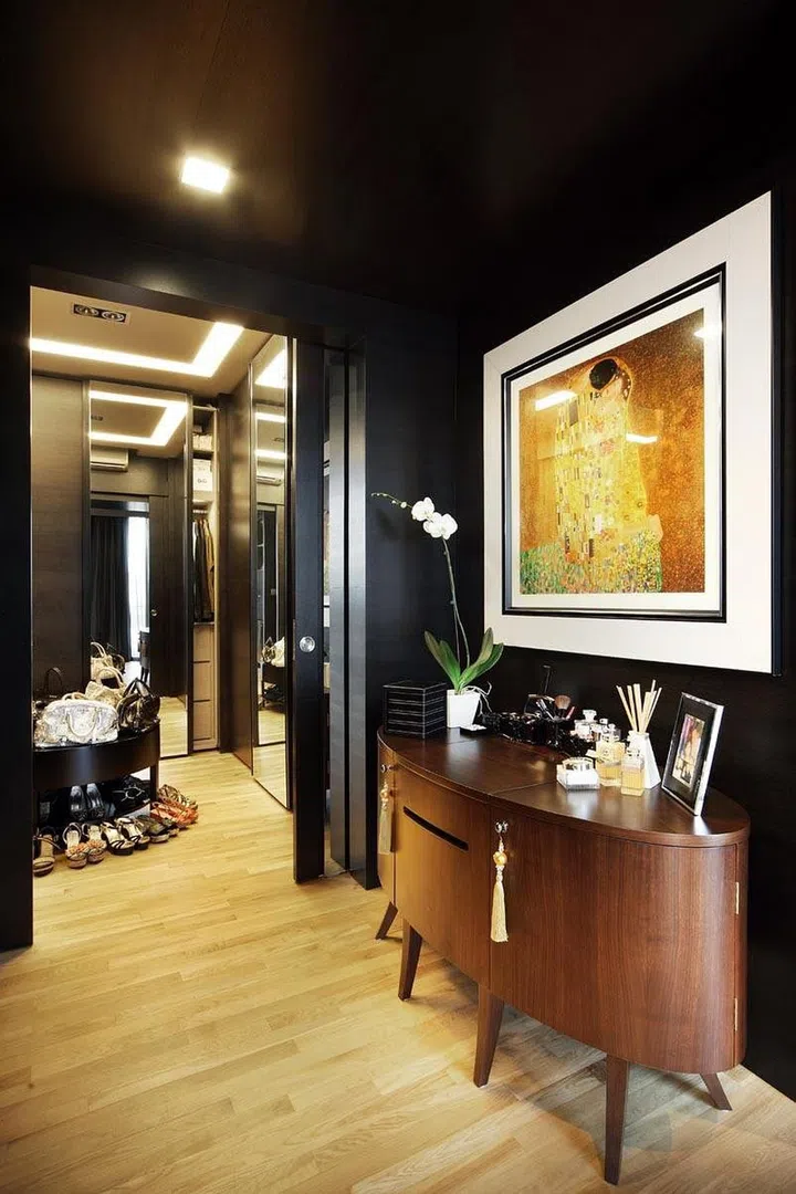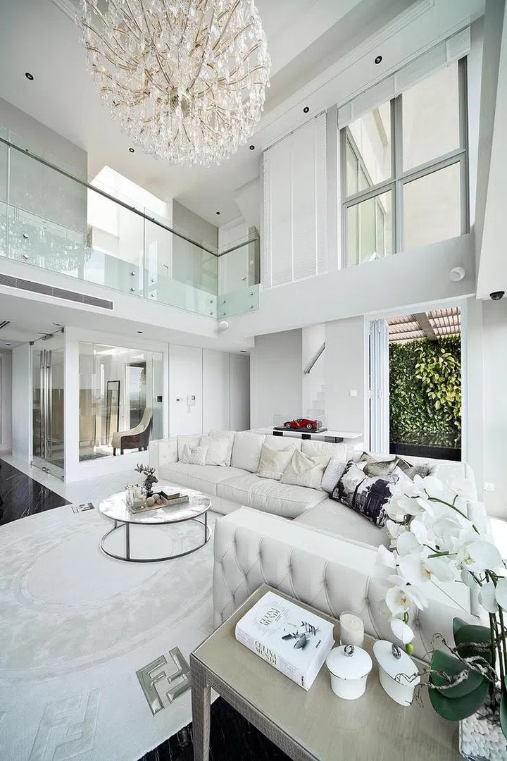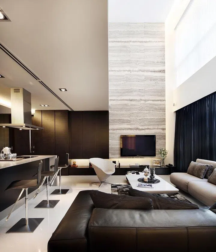 With the double volume height in the living room of this apartment, the designers created a full-height feature wall on which the TV is mounted on, to accentuate the height and loftiness.