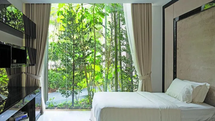 The dense foliage caress the many glass surfaces of the house, even those on the second storey where most of the bedrooms are.