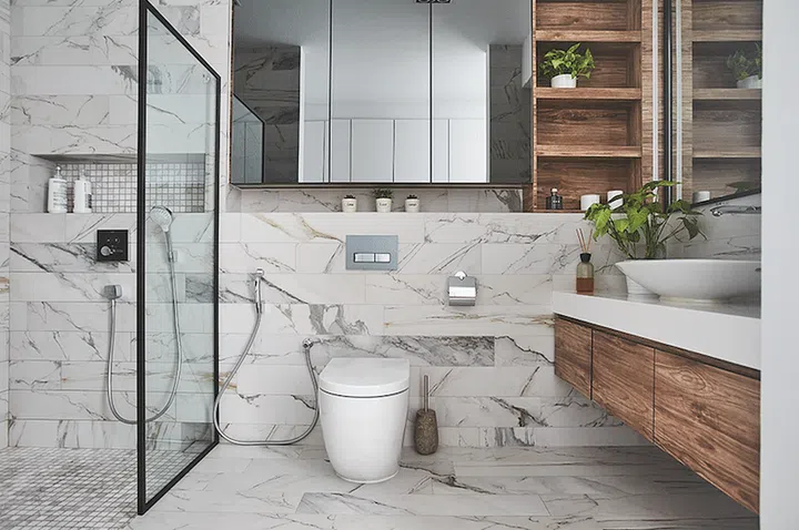 In the bathroom, the walls and floors are decked in luxurious white marble-look tiles, installed in a staggered strip pattern.