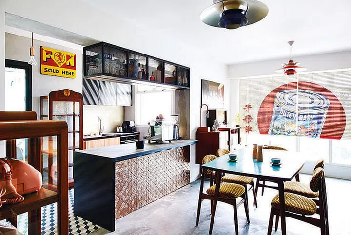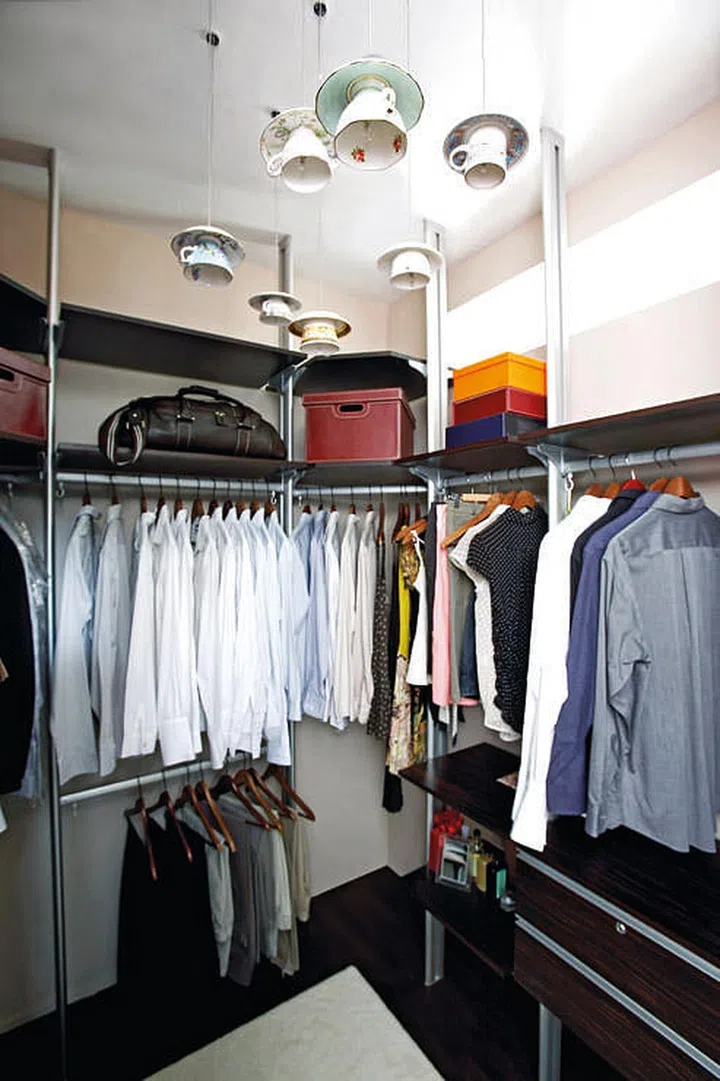Cool feature: Designer Ivan Sim drilled holes into the teacups and saucers, then turned them upside down to make bespoke lights for the walk-in wardrobe.