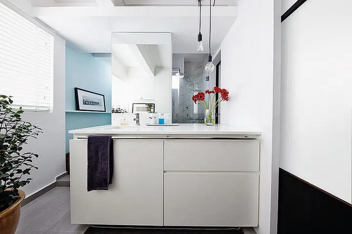 Cool feature: There are two entrances to this elongated bathroom cum laundry room (behind this vanity counter is the WC and shower area) -- the door in the foreground leads to the kitchen, whereas the one in the background leads directly to the bedroom.