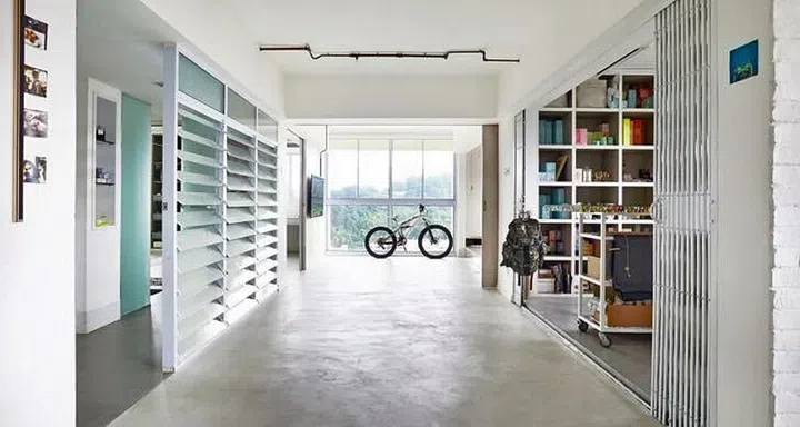 Cool feature: Now, this is what you call open-concept! Only blinds separate the living from bedroom.