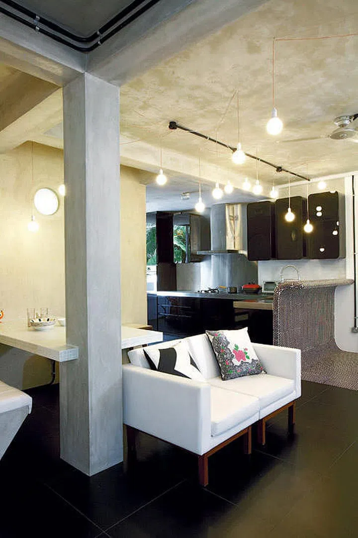 Instead of just a single pendent lamp, this designer created a decorative feature for the home with rows of exposed-bulb lights for an industrial look.
