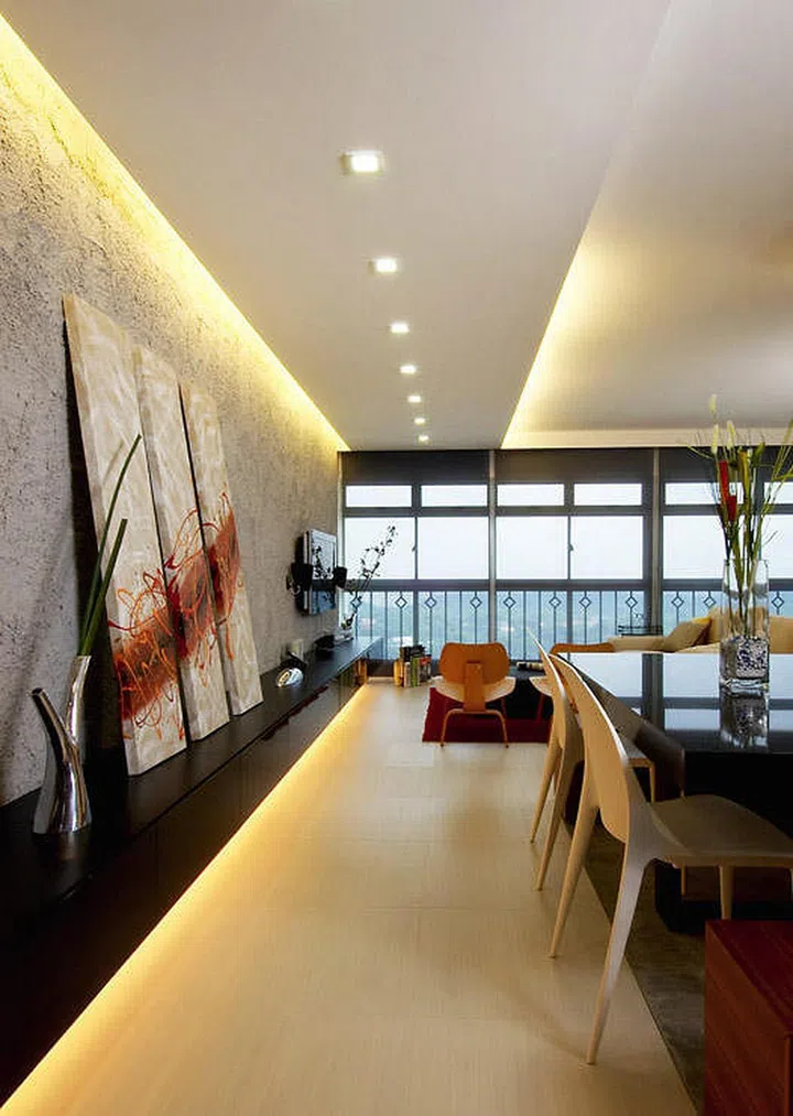 Unlike down lights, cove lighting brings a soft, muted glow to rooms. This designer made use of both cove lighting and pin lights to emphasis the length of the living room's walkway.