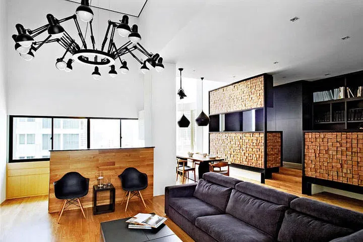 Want to impress visitors? A massive light feature in the middle of your living room will definitely be a great talking point for when visitors come by! This designer gave the light feature more prominence by using smaller down lights in the living room.