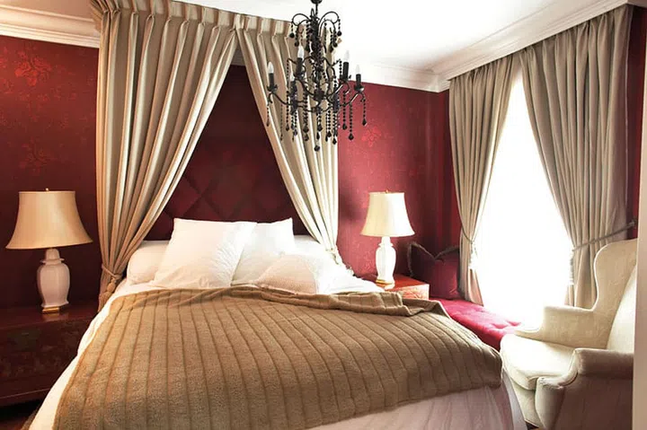 The canopy over the bed and black chandelier give this bedroom a distinct European aesthetic.