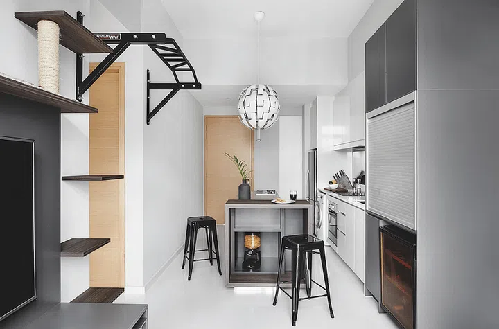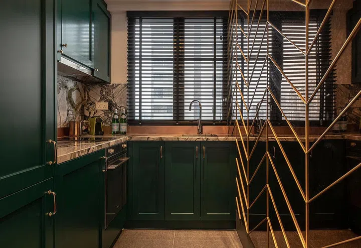 To create ample storage in the kitchen, the designers from Lemonfridge Studio built a concealed corner unit to accomodate their many utensils. This keeps the countertops clutter-free without compromising on countertop space.