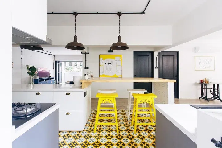 This island counter serves as additional dining area or simply a space for guests to chill out at. The designer from The Local Inn.terior chose retro-style patterned tiles to frame the kitchen counter area.