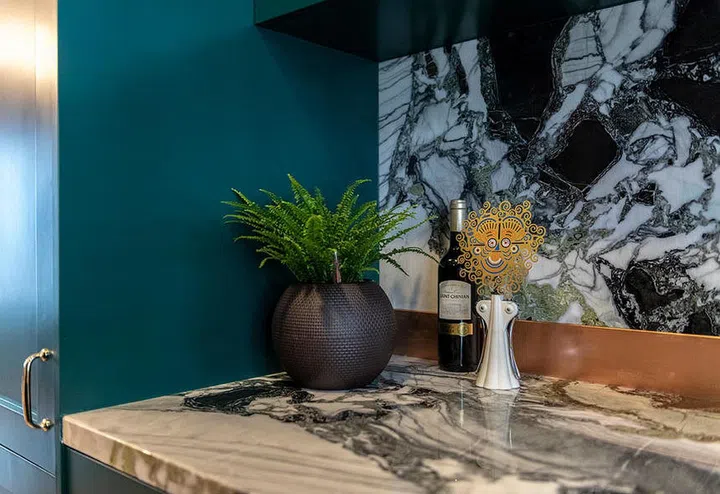 Arjan gave the kitchen dark rich green cabinetry; the grey, white and green marble brightens the space, while brass handles and a copper backsplash add a touch of luxury. See more of the home here.