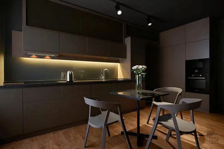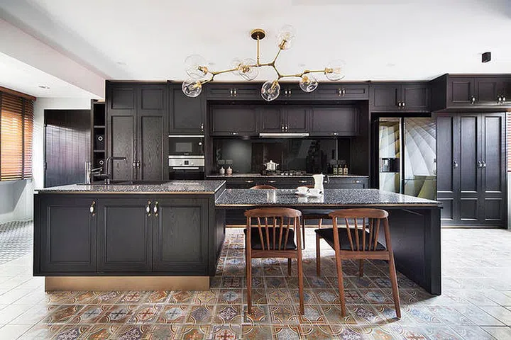 The wood-look finish prevent this all-black kitchen from looking one-dimensional.