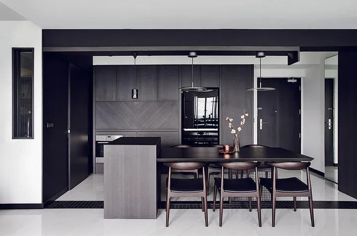 Dark grey laminates were used throughout this four-room BTO. Gold and silver hexagonal backsplash give the kitchen a luxurious look.