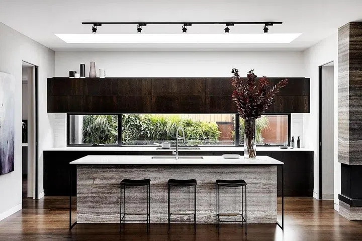 Natural materials like travertine stone and dark wood cabinetry make up this sleek and contemporary kitchen.