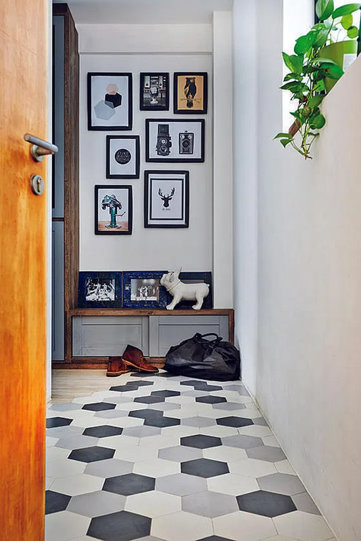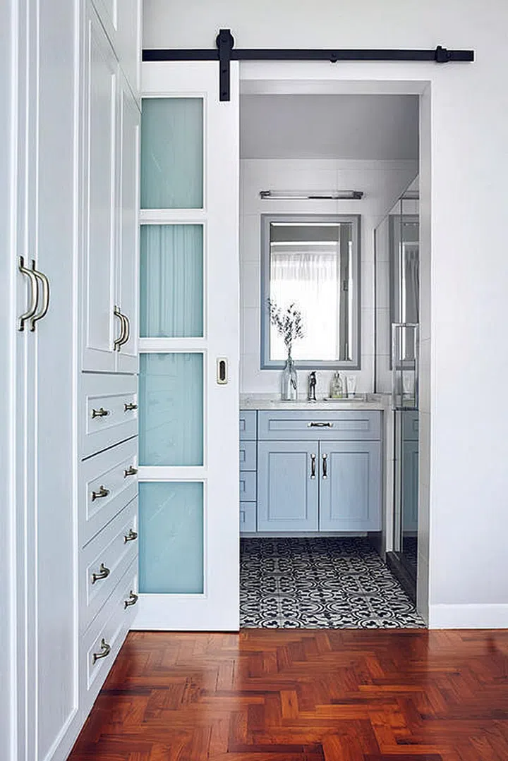 For this master bathroom, the designers alternated between square mosaic tiles, geometric cube motifs, and marble.