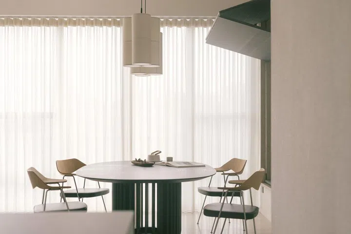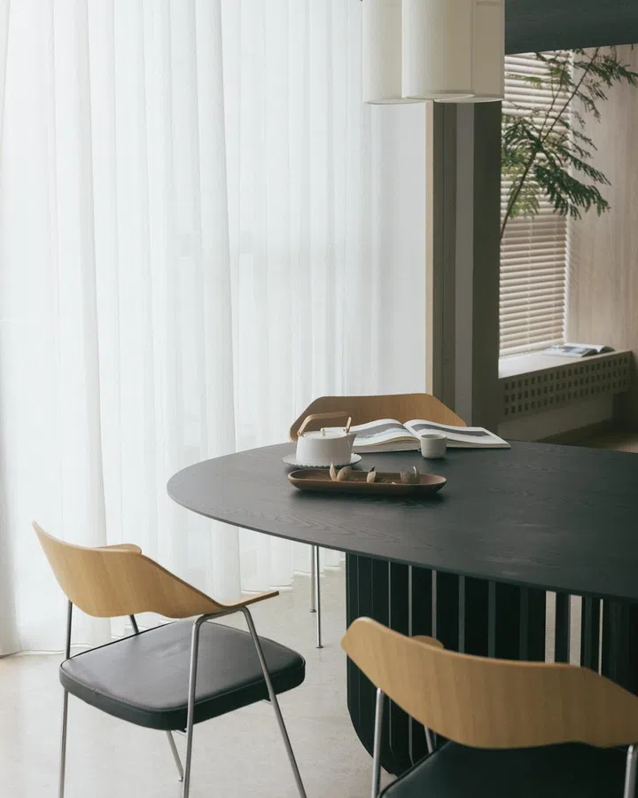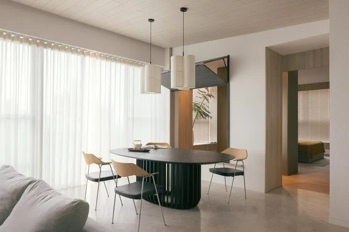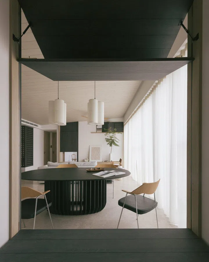 A vertical bi-fold window was introduced in the wall separating the dining area and master bedroom. It opens towards the former to form a cantilevered, roof-like element below the apartment ceiling that gives the dining area a more human scale.