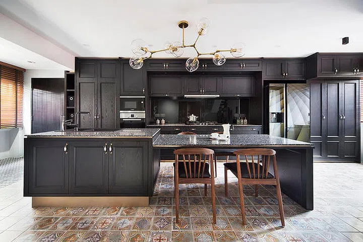 Here's another all-black kitchen, which features accents of silver and brass.