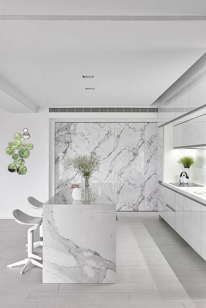The designers introduced luxury and depth in this all-white kitchen with marble-look features.