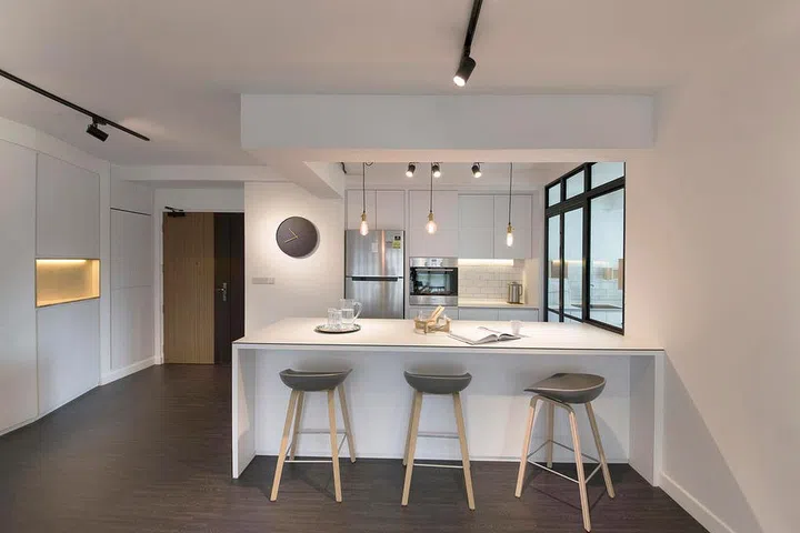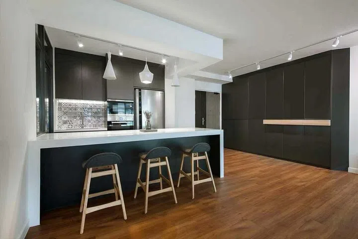 With sleek black subway tiles, dim lighting and wooden chairs, this kitchen almost looks like a cafe!