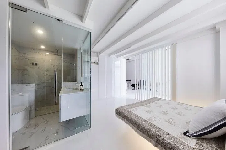 As for the main bedroom on the ground floor, Kelvin created a loft-like look by adding artificial ceiling beams. To keep the area from feeling claustrophobic, swing doors for the room and bathroom were replaced with glass to ensure a sense of openness and allow natural light to fill these spaces.