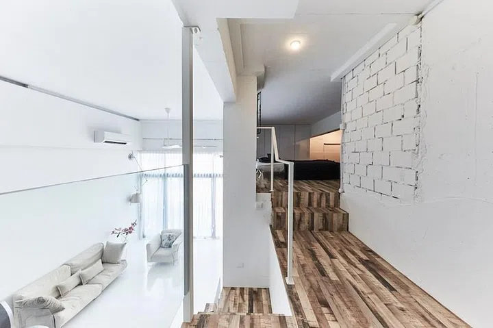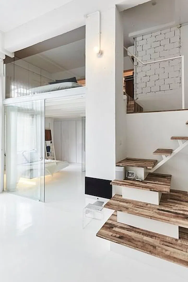 A false ceiling was removed to obtain even more overhead space. This enabled the construction of a mezzanine level where the guest bedroom is now sited.