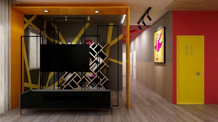 A collection of wooden frames serves as the background for the TV wall, bordered by yellow panels in keeping with the hip and vibrant theme.