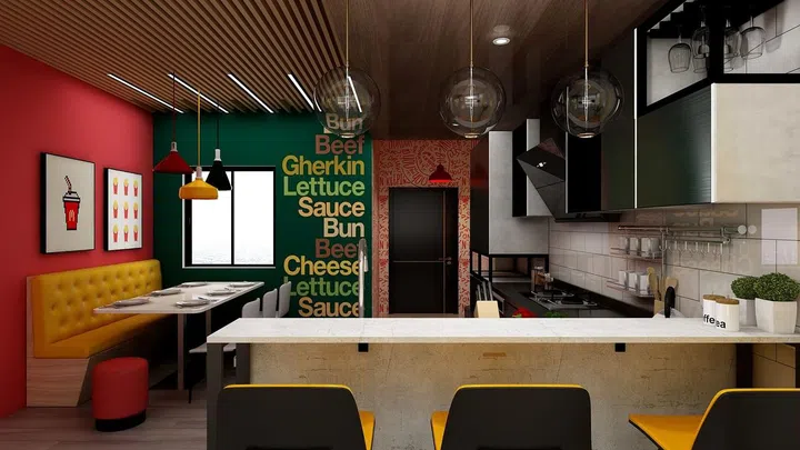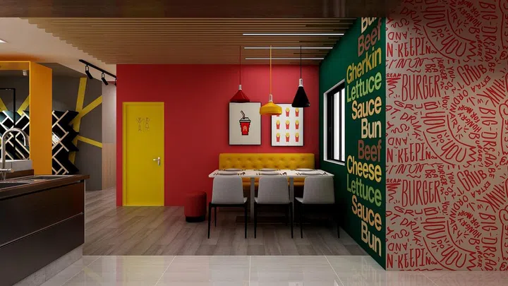 From this angle, you can see the bright red wall matched with a bench in contrasting dark yellow colour. The iconic green wall with the burger ingredients can be found next to it.