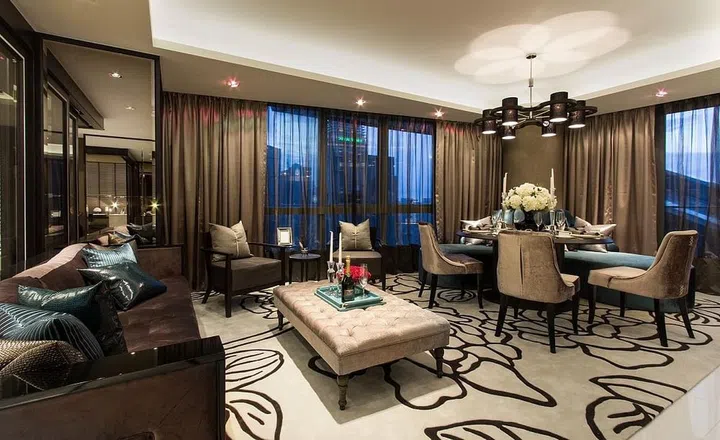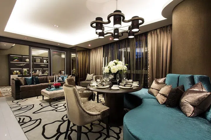 Fitted in rich browns and golds, the open-concept living and dining areas have a touch of blue as a highlight.