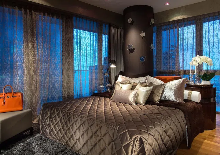 Nominated in the Bedroom category, this bedroom at One Shenton has dark interiors to create intimacy and mood.