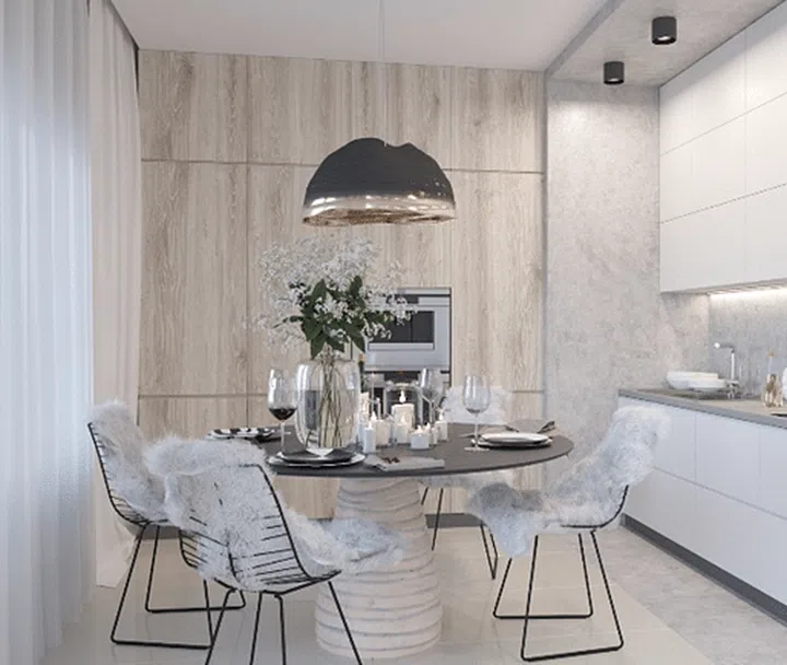 Clean, spacious and light, this apartment is able to exude an inviting atmosphere thanks to the nature-inspired elements, from the wood-look doors in the kitchen to the wooden stumps in the living room -- albeit in a whitewashed effect.