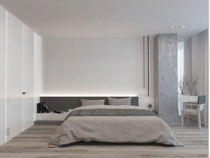 In the master bedroom there are many surfaces with different textures, such as bare concrete, solid wood, and textiles. These work together harmoniously, as they are of a single color scheme.