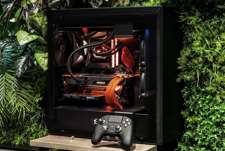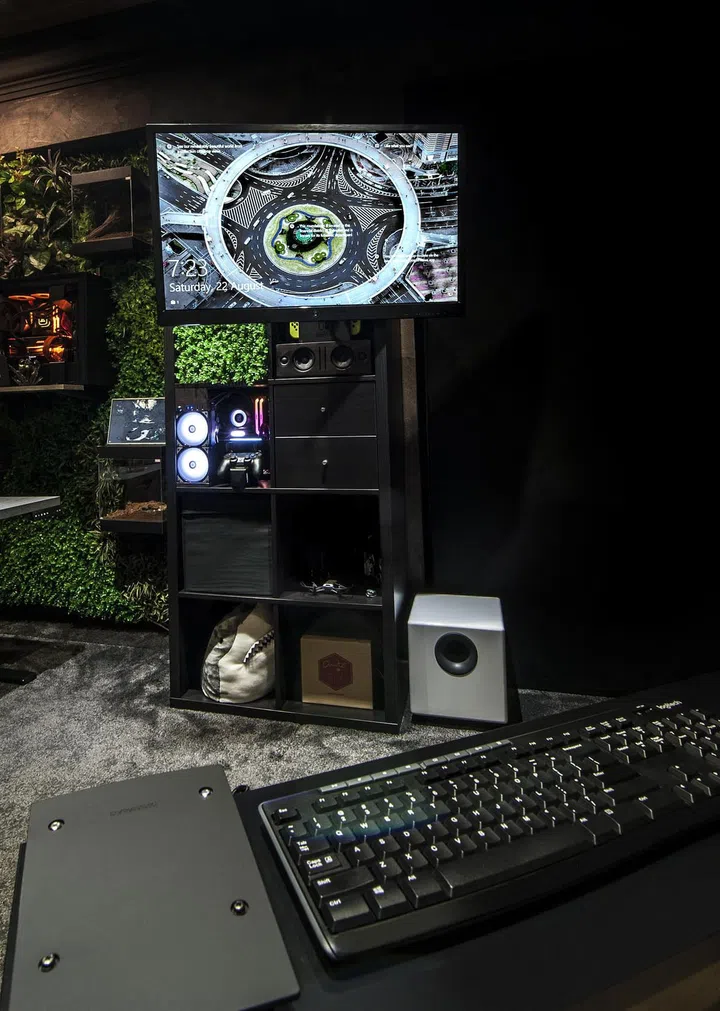 I love immersion and good sound, so I went with a 34" Acer X34P ultrawide monitor. The vertical monitor I use it for coding. The front speakers are Dynaudio Xeos, chosen for their excellent nearfield performance and ability to perform in a space-limited setup. Rear speakers are my old Audioengine HD3s, hidden behind the 2 patches of plants you see above. An Audioengine S8 adds the much needed boom!