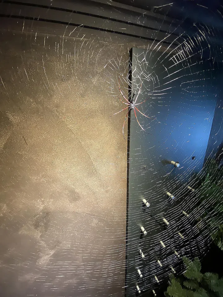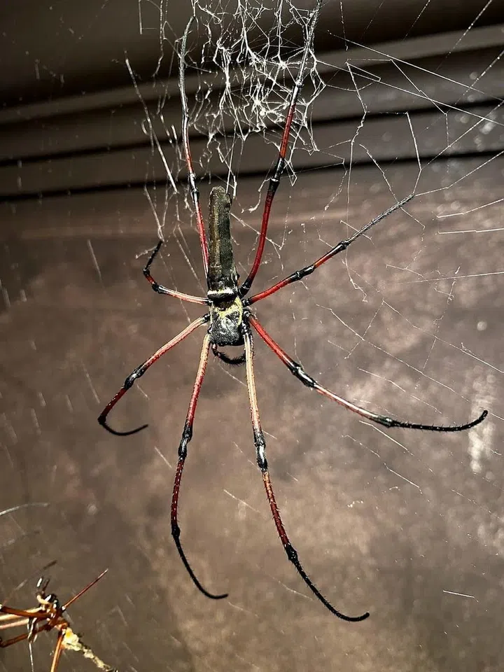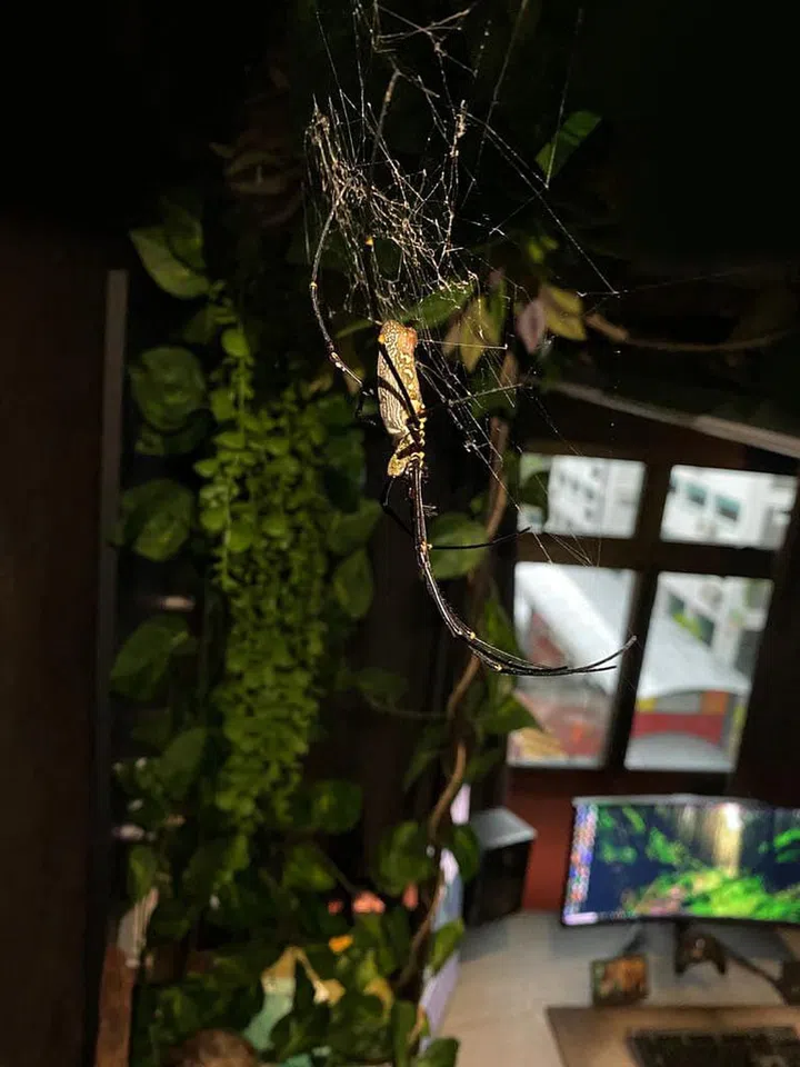 And now, introducing the free-roaming spiders of SWDC! This is Stacey, a gigantic Golden Orb Web Spider proudly watching over her office. She is the first free-roaming spider in this room, and nothing makes my day more than visiting her in the morning as I start my day.