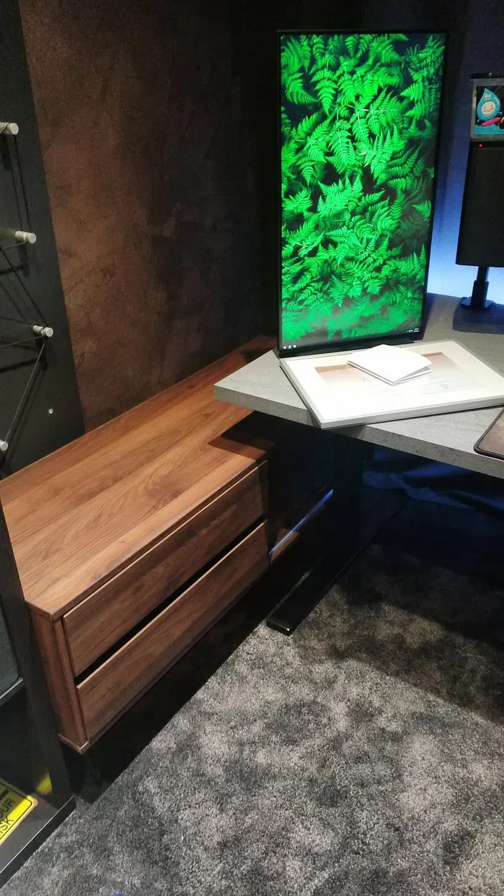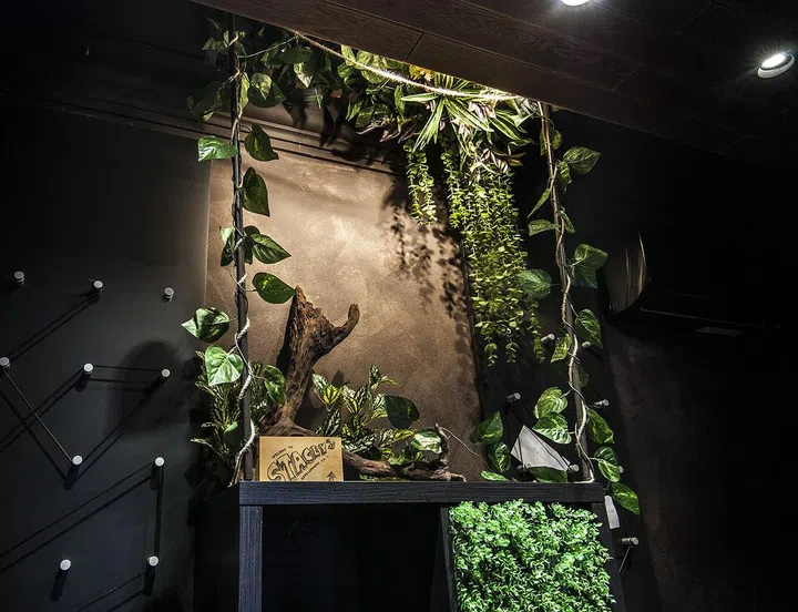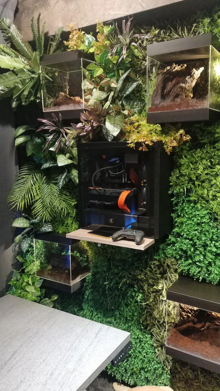 This is the human's corner. I built it to have some of my favorite tech around, but at the same time to be enveloped by greenery and not having a single wire in sight. Every single light, including basking lights for the spiders, air conditioning and 2 PCs are controlled via a Smartthings Hub, which I control using the Google Nest Hub under the monitor.
