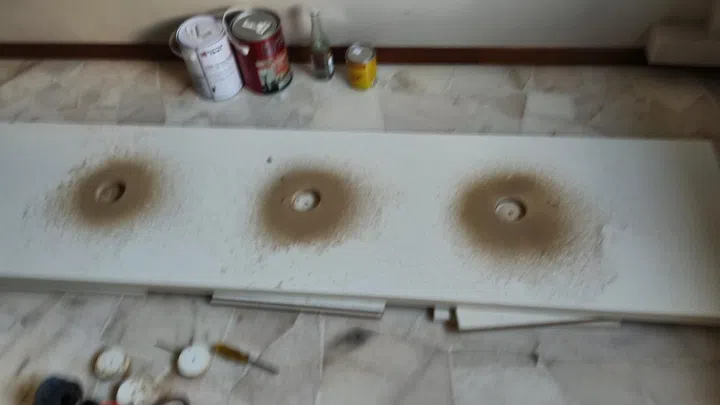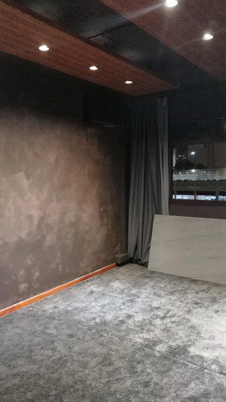Both of them mounted. I also installed a new curtain rail and some thick, heavy curtains. Meanwhile, I also had a piece of plywood cut and laminated in a concrete look for my tabletop. You can also see what I am planning with the cupboard doors! They look great as feature pieces, and will help future spiders web more easily.