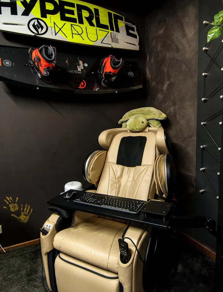 This is the wife's gaming station from her POV. It's powered by a custom-built PC (next photo) and also has a Nintendo switch. Surround sound is achieved by hooking the speakers on the massage chair up to the rear speaker channel. Main speakers is an Audioengine B2.