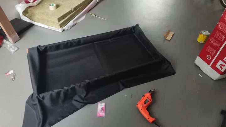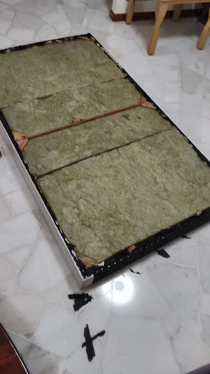 I also built another 2 smaller frames using some plywood. These will hang on my window, right behind my main speakers. They were also rockwooled up! I designed them to hook onto the sliding window frame, so they can slide with the windows.
