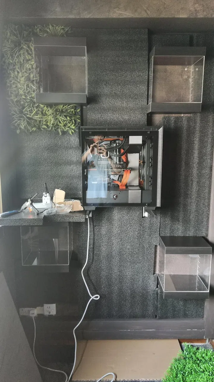 Next up was the alcove. I decided to make it a plant feature wall to hold my PC, and 4 tanks for whatever I might want to keep in future. I made 4 acrylic boxes to the exact dimensions of the IKEA Lack shelves. The shelves were drilled into the wall, and the boxes simply slide in. This gives a really clean look. No hinges, lids or doors. The middle was a shelf bracket to hold my PC.