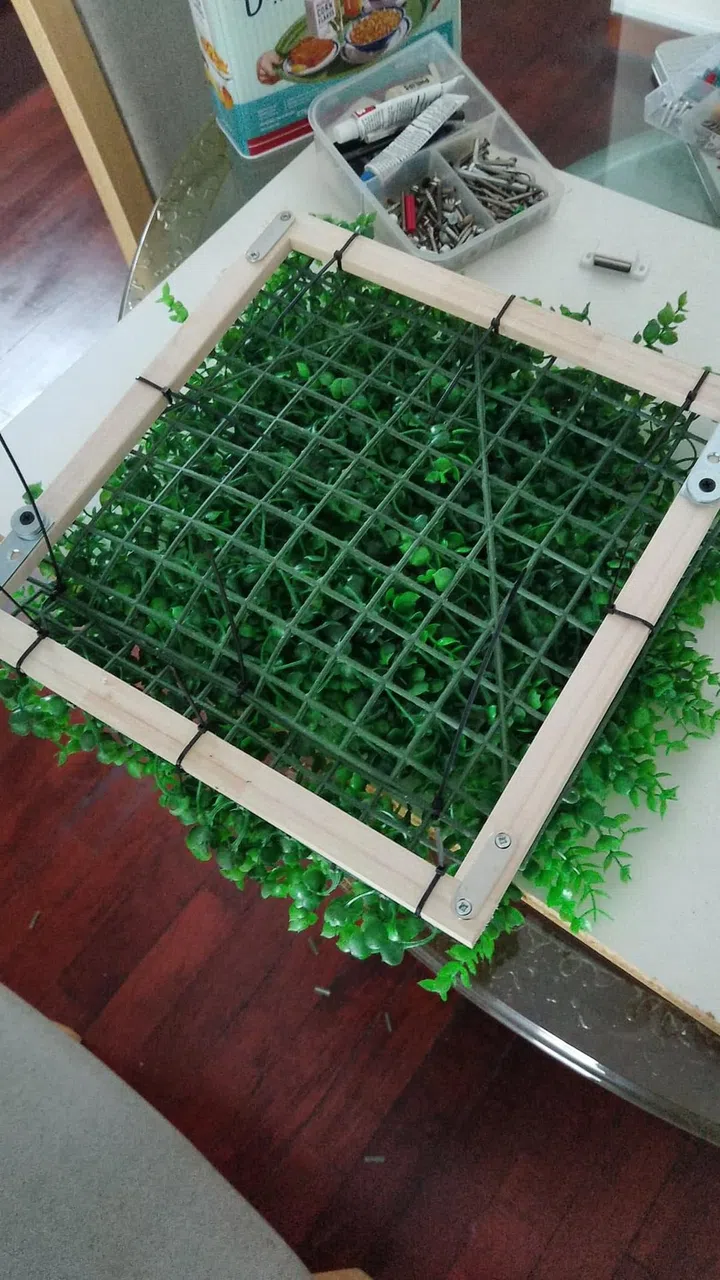 I built a simple frame from some wood and leftover plant panels to hide the speakers.