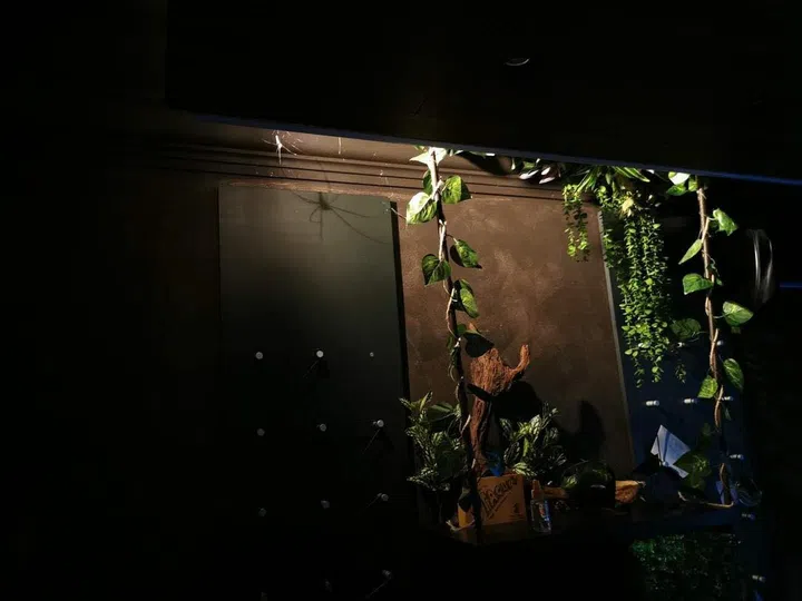 Stacey and Pepper used to live in that little vine-y corner on the left, which I built to let them web easily. You can also see where my old wardrode doors are at now. I'm really pleased with how it turned out, but I will be revamping it soon. Mostly to remove the carpet and setup a live plant/ high humidity area for free-roaming spiders. Also to paint the ceiling a lighter color so I can attached some cove lighting and brighten the room up.