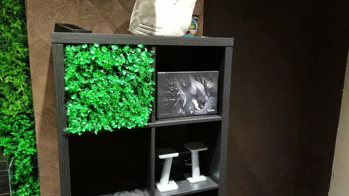 I test fitted the PC and started building the foam wall. The foam wall helped with sound-treating the room and attaching the fake plants. I cut air channels for the PC's intake ports and the ventilation for the tanks. With the foam securely glued in place, I started with the flat plant panels, mixing a few different types together to give a flowing design.