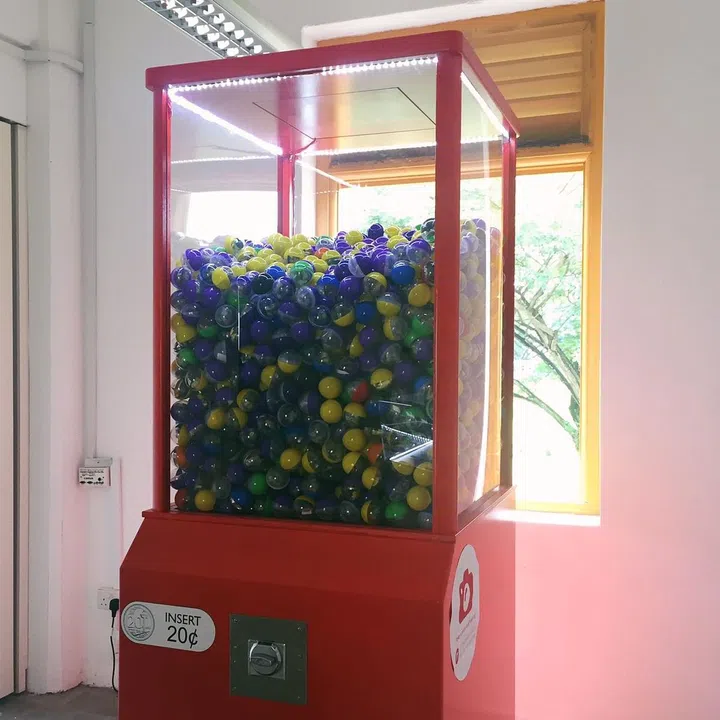 This giant vending machine triggers a sense of nostalgia and playfulness! Insert 20 cents coins and turn the knob (you know how it goes), and see if you'll receive a ball of candy, a country eraser, and the old-school stacking pencils!