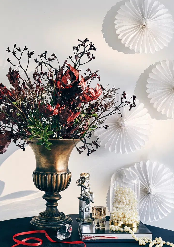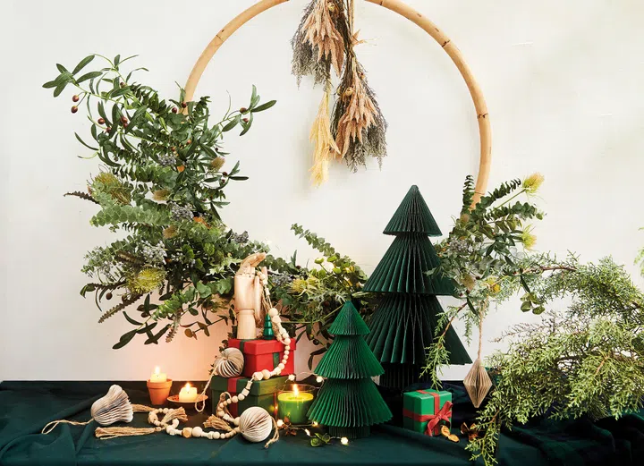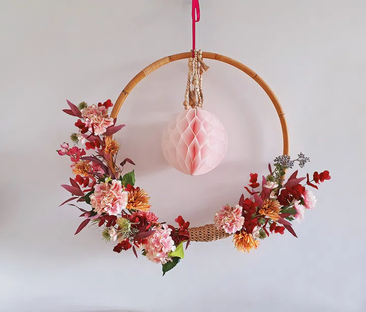 A rattan ring décor piece is incredibly versatile and works beautifully for both Christmas and Chinese New Year. This styling is especially great for those who love a vertical focal point. For Christmas, decorate the ring with artificial foliage in greens.