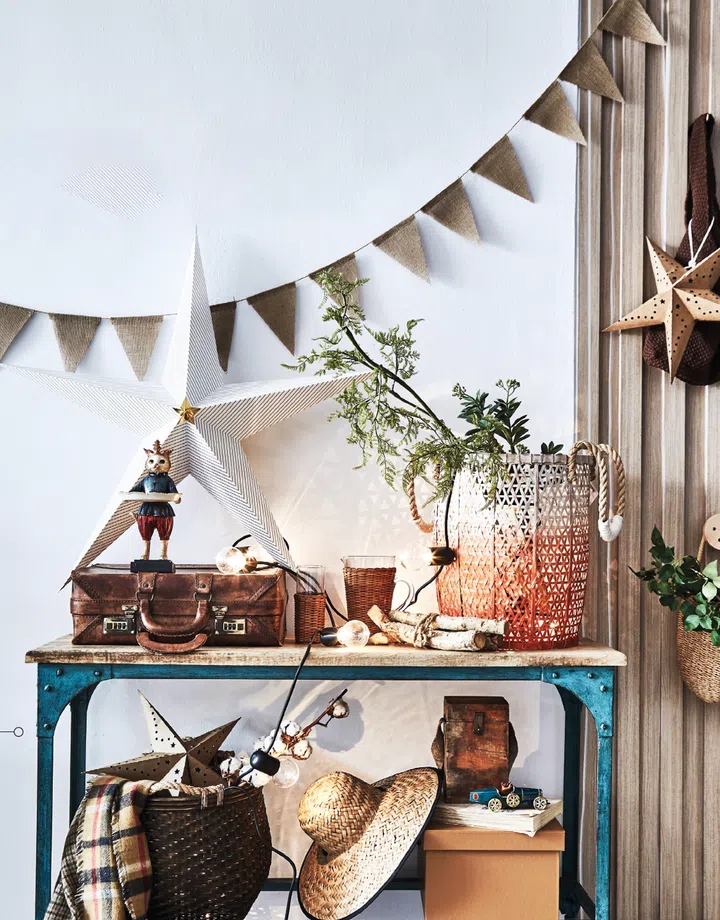 Your entrance sets the tone for the entire festive gathering. Dress it up with oversized paper stars, vintage ornaments, and natural materials like wood and rattan baskets.