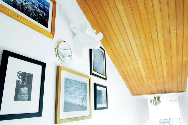 Personal touches elevate the stairway into a gallery space, with the owner’s original artworks and photographs adorning the walls. This DIY approach not only adds authentic character to the retro-styled home but also demonstrates how budget-conscious decorating can yield stunning results without compromising style.