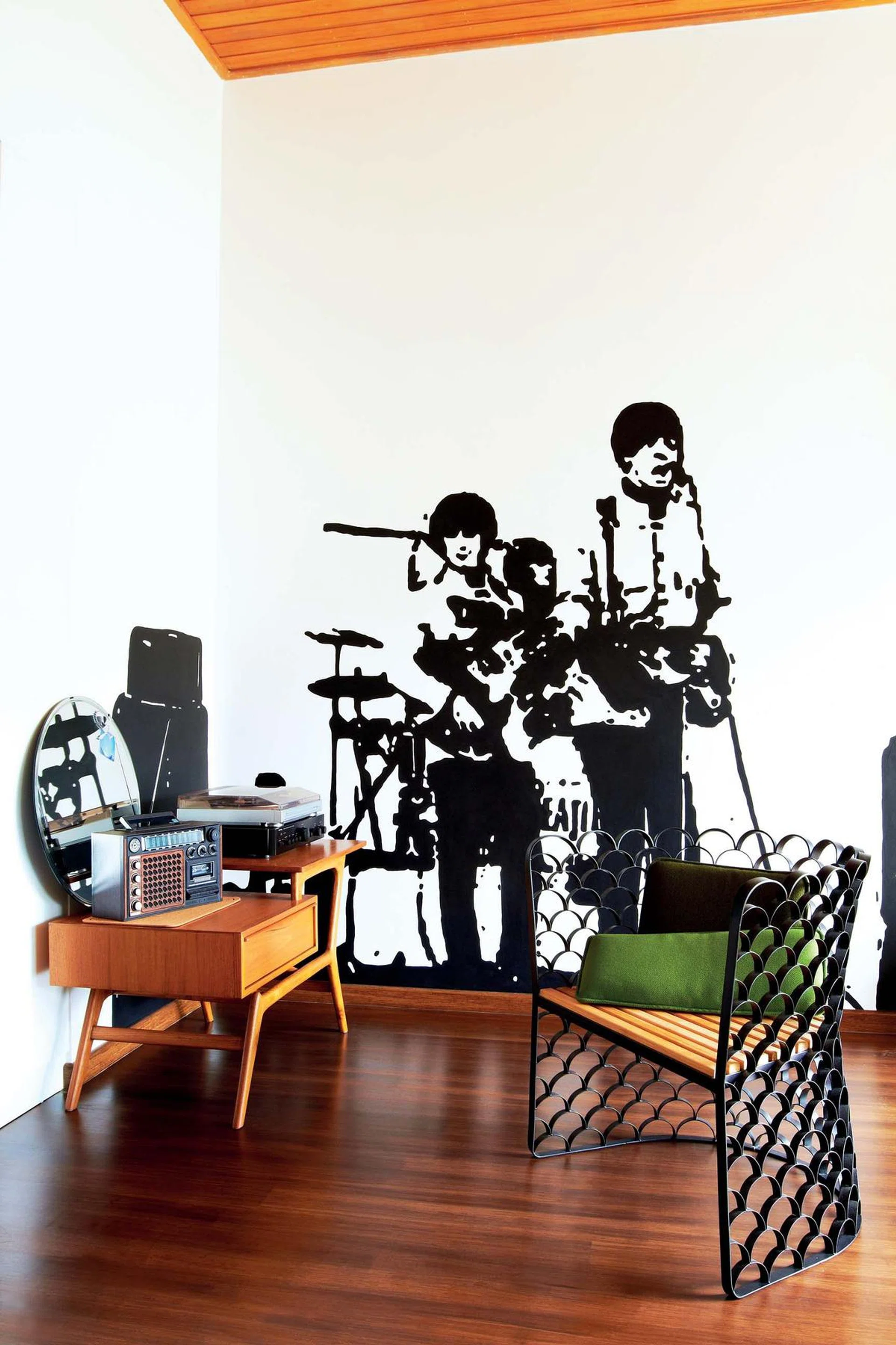 The nostalgic pedigree of the “band” artwork perfectly complements the retro-styled home’s overall aesthetic. Dark brown bamboo flooring provides a rich foundation throughout the space, while wooden shelving units serve as a consistent design element that ties different areas together, creating a cohesive look that bridges both vintage and modern sensibilities.